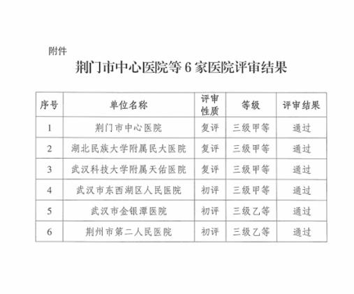 武科大网讯 近日,湖北省卫生健康委员会公布了我省6家医院等级评审结果。我校附属天佑医院以优异的成绩顺利通过三级甲等综合医院复评。
