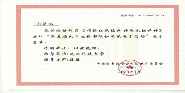 我校高度重视并积极参加此次活动,校图书馆与校团委、演讲与口才协会、国际学院合作,精心组织了校内选拔赛并推荐了孙运韬的作品代表我校参加这次活动。她参阅王树增的《长征》后撰写并录制了《颂读红色经典 传承长征精神》的演讲视频作品,该作品最终进入全国优秀作品展示名单。国际学院魏敏老师获得优秀指导老师奖。