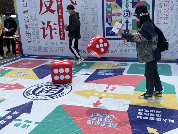 游戏互动区的气氛也十分火热。套圈游戏吸引了不少学生通过套圈鼓励学生下载国家反诈APP。反诈飞行棋更是有着极高的人气参与者从地图上的起点出发,一路闯关躲避诈骗陷阱获得奖励,最后抵达国家反诈中心终点。掷骰子、识陷阱,考验运气,更考验反诈头脑,在欢快的气氛中学生们学习到了许多反诈知识。保卫处治安科杨阳:通过游戏互动与反诈知识相结合的模式更能让同学们在寓教于乐中了解反诈防诈知识增强同学们的财产安全意识
