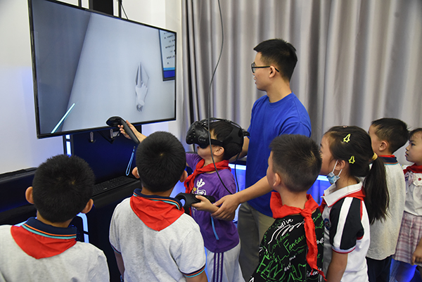 戴上VR模拟器,小朋友们瞬间置身于校园火灾的场景中,需要通过手柄操作找到火源扑灭火势才能成功逃生。该院安全工程系研二学生余恺瑞在一旁细心引导,并科普相应安全知识。“大家在校园里一定要熟记安全出口,遇到危险时迅速撤离。”他说道。