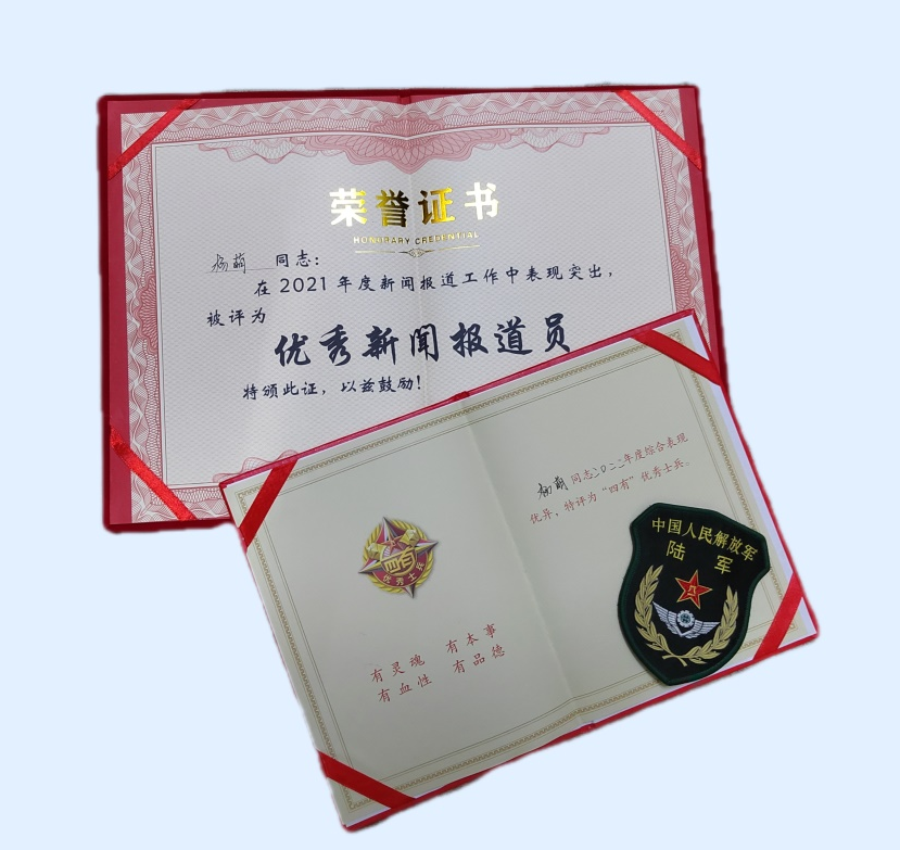 荣誉是对我工作成绩的肯定,也是我军旅生涯里的重要收获。2021年底,我荣获了单位年度新闻报道优秀个人;退伍时,也被评为“四有”优秀个人。感谢组织的认可,感谢身边给予善意和帮助的所有人,也感谢一直坚持的自己。