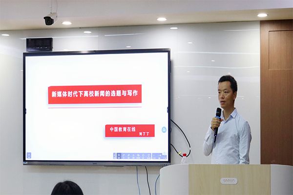 武科大网讯(见习记者陈雅雯 摄影廖温馨)为了提高我校学生的宣传工作能力,5月12日,校报记者团邀请中国教育在线主编刘丁丁在教11A区417进行新闻培训。我校党委宣传部副部长饶红亮、校报主编程毓、各学院宣传人员及校报记者团成员共同参与了本次培训。