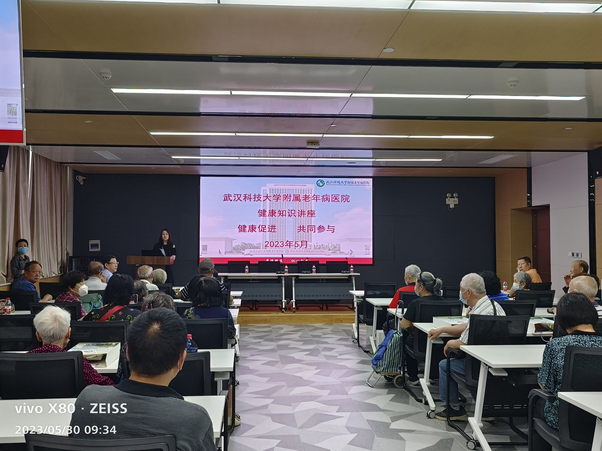 武科大网讯 为提高我校离退休教职工的健康意识和健康素质,促进老年朋友养成文明健康的生活方式,普及健康知识,5月30日,我校离退休工作处和附属老年病医院联合开展以“健康促进 共同参与”为主题的健康知识讲座,我校70余位离退休教职工参加了本次活动。活动由离退休工作处处长李婵娟主持。