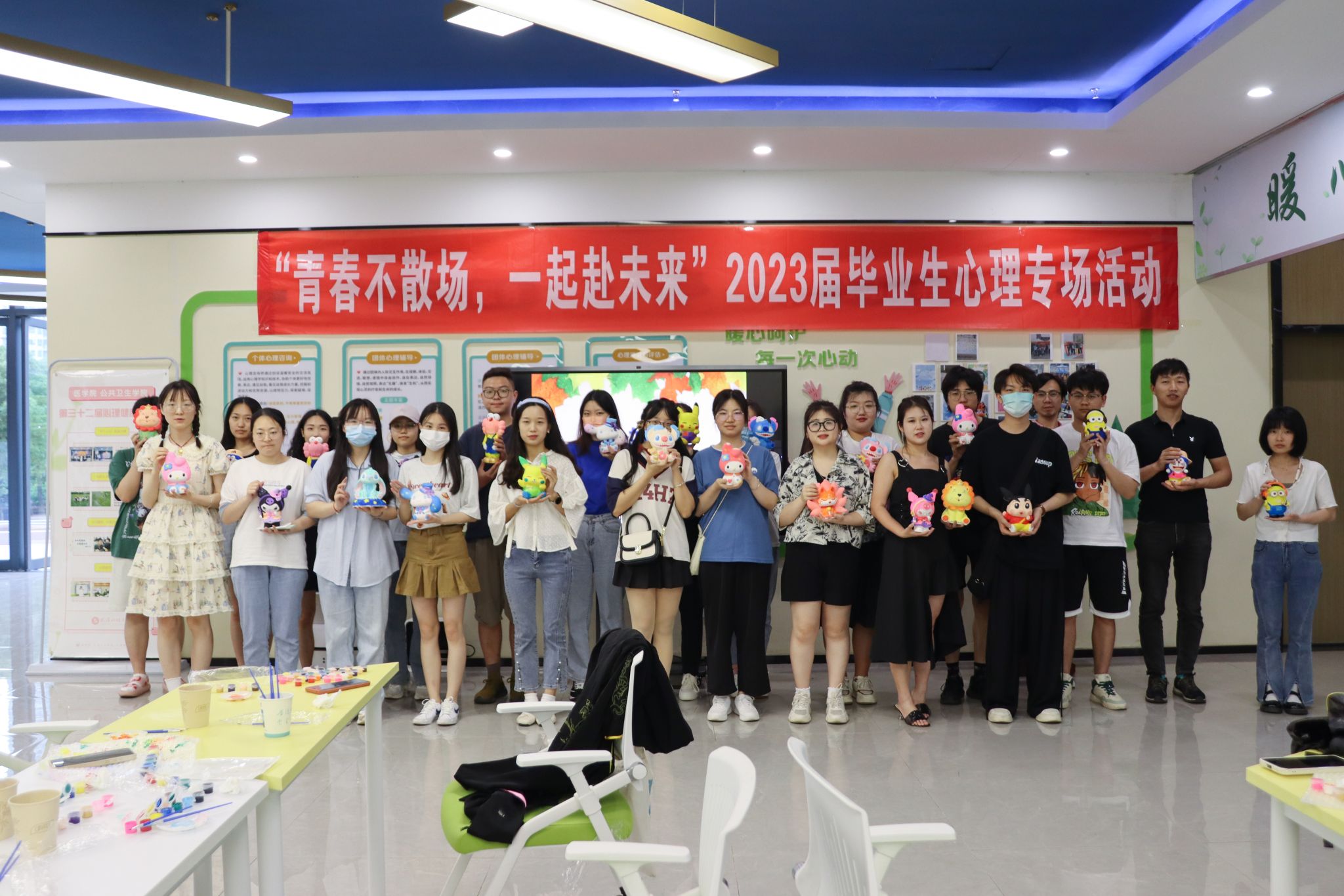 不同于平时的彩绘活动,这一次的绘制大号石膏娃娃活动是毕业生的专属体验。作为此次彩绘活动带领老师,贾健宇感慨道:“希望毕业生同学们倡导‘慢生活'加强对自我的关照。”他表示,希望学生们未来的人生路上也能用手中的“画笔”描绘出自己五彩斑斓的人生,做个“好娃娃”!