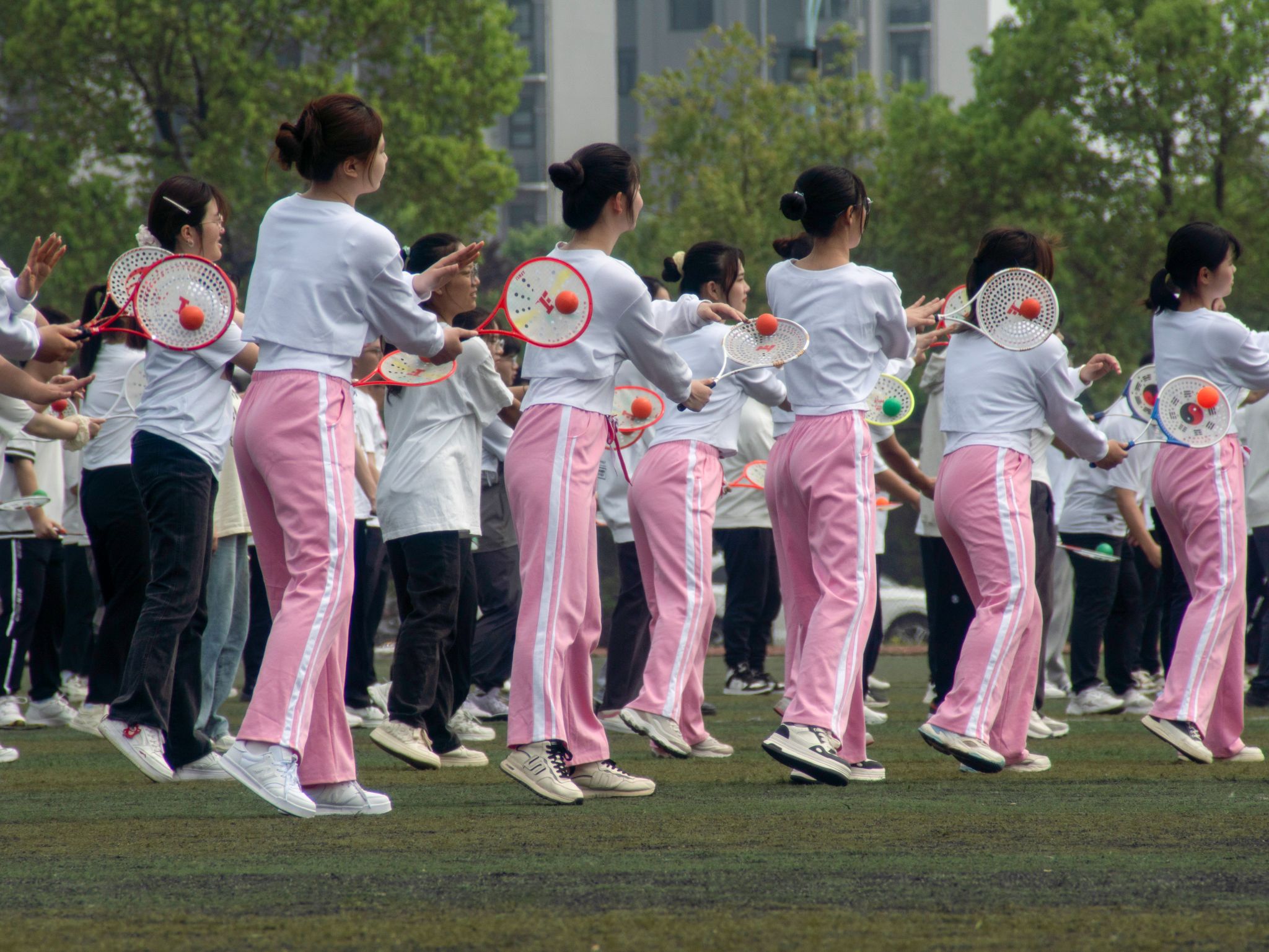 走、滑、转、抛、收……在湖北省柔力球运动协会特约教练周桂玲的教授下,近500名选修柔力球的学生在北园操场进行柔力球展演、学习。据了解,每年我校都会举办类似的大型展演。“我们希望通过开展这样的展演让更多的人爱上柔力球。”体育学院教授刘占锋说道。
