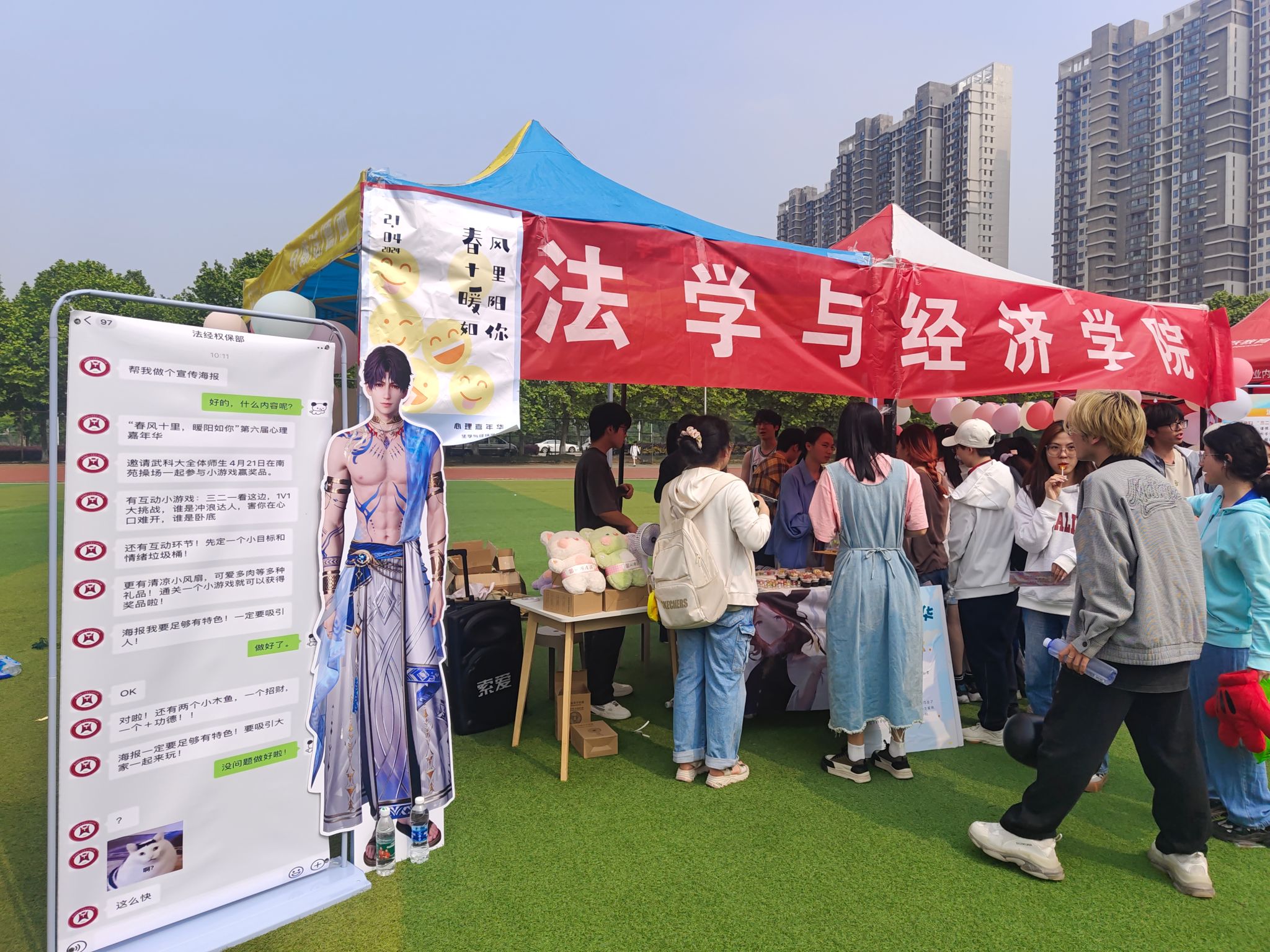 法经学院帐篷前的易拉宝和人形立牌吸引着不少学生。“三二一看这边”“谁是卧底”“谁是冲浪人”等游戏串联起来的闯关模式让人越战越勇。“法经学院的游戏都很有趣,社交性非常强,一关一关闯过让我感到非常有成就感,最后得到的奖品也很丰富。我和同伴相约而来的,它让我们感受到了学习之余的放松与惬意,也加深了我们之间的友谊。”梁玉杰热情地分享道。