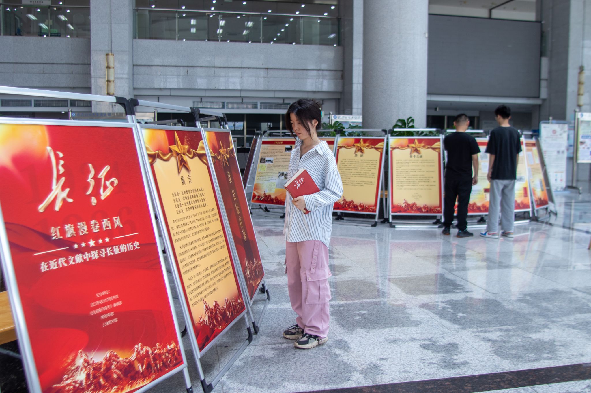 为致敬长征出发90周年,我校已于一周前在图书馆设置了“探寻长征”文献展,用四十多块展板回顾红军长征时的关键历程,辅以陈列相应的书籍。自动化2304班唐思彤正在学习《中国近现代史纲要》课程,此次她特意前来观看学习,看完后的她不禁感叹:“先辈们的长征路充满艰辛,我们要更珍惜来之不易的今天!”