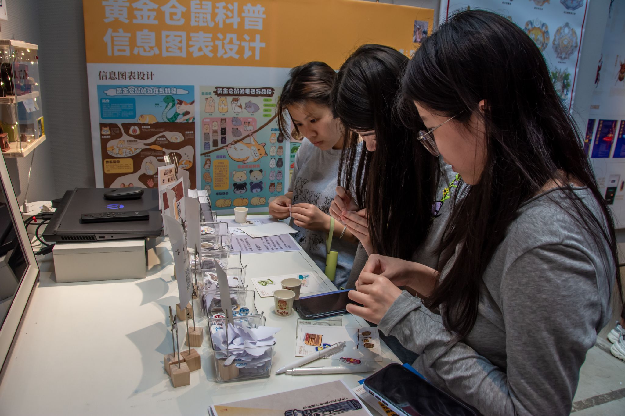 现场还展出了不少以儿童潮玩与非遗结合的作品,如交互麋鹿作品。麋鹿在荆楚文化中是祥瑞的象征,观赏者一声“小鹿小鹿”便能让麋鹿玩具播放音乐、营造氛围灯光。该项目指导老师彭红表示:“我们希望该产品能在交互陪伴中潜移默化地增强儿童对中国传统文化的认同感,让他们感受鲜活的文化。”展览上,不少学生参与到展品diy创作中。