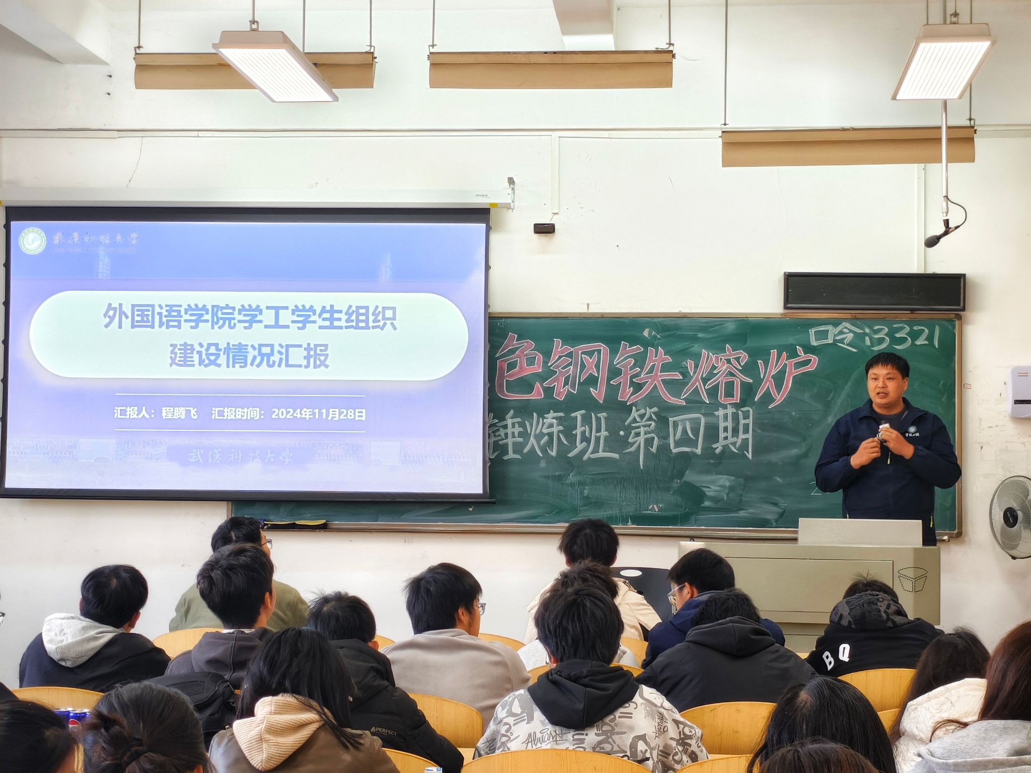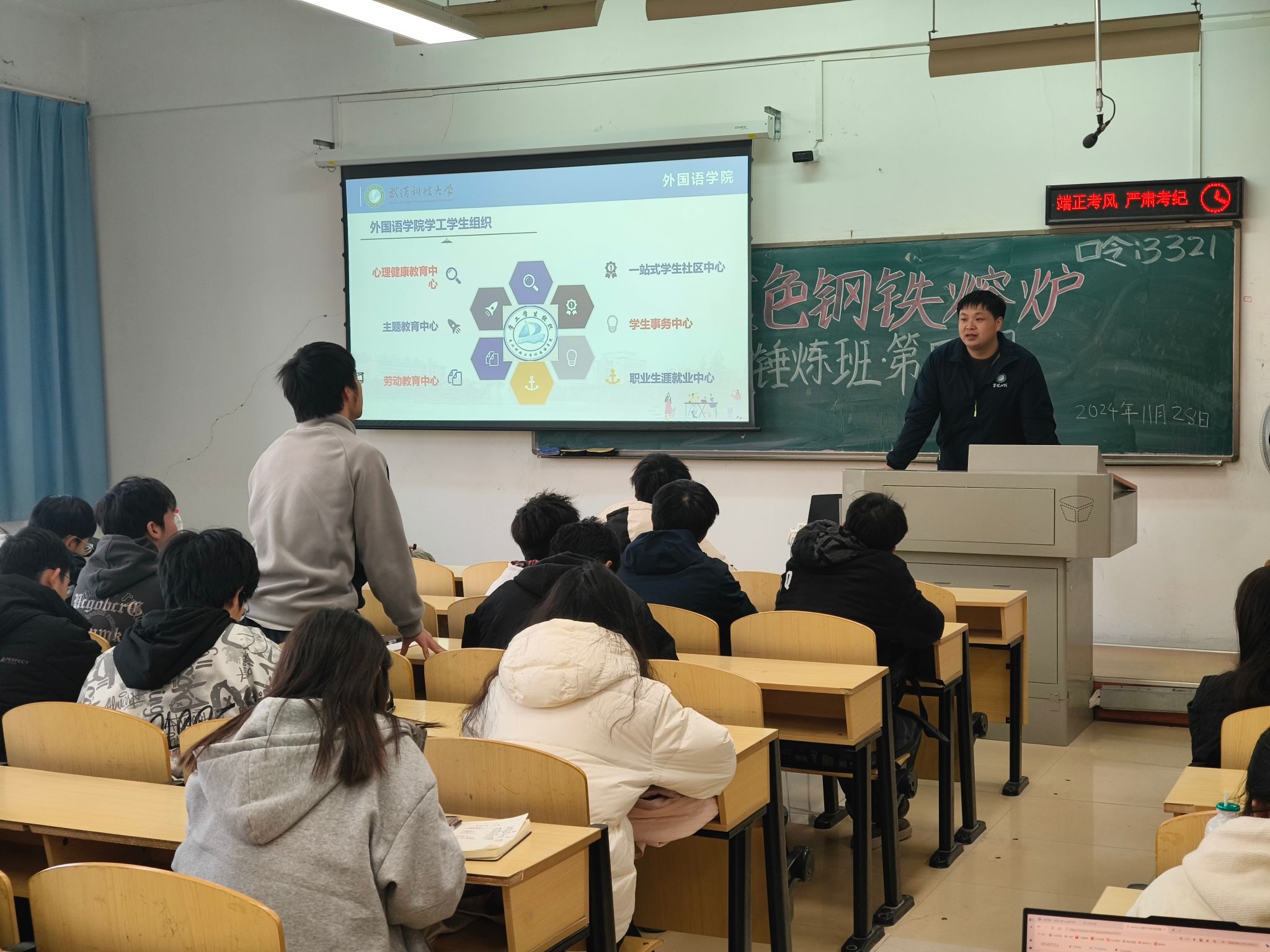 武科大网讯(通讯员张敬轩 摄影李紫浩 冉舒心)11月28日,“红色钢铁熔炉”学生思政骨干训练营·锤炼班第四期培训在主楼 11403开展。本次活动特邀外国语学院辅导员程腾飞担任主讲人,围绕“学生组织架构”主题展开,帮助学员系统学习组织管理知识,明确组织架构在学生工作中的核心作用。